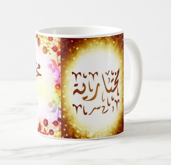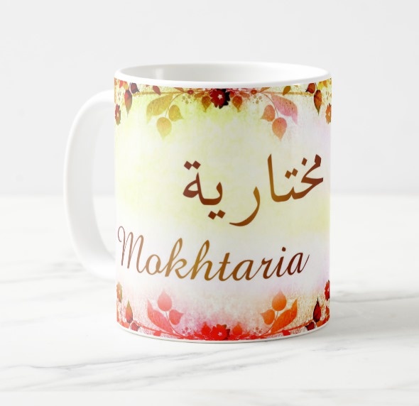 Mug avec le prénom "Mokhtaria" écrit en français, en arabe (مختارية) et calligraphié de façon artistique en arabe sur la partie droite.