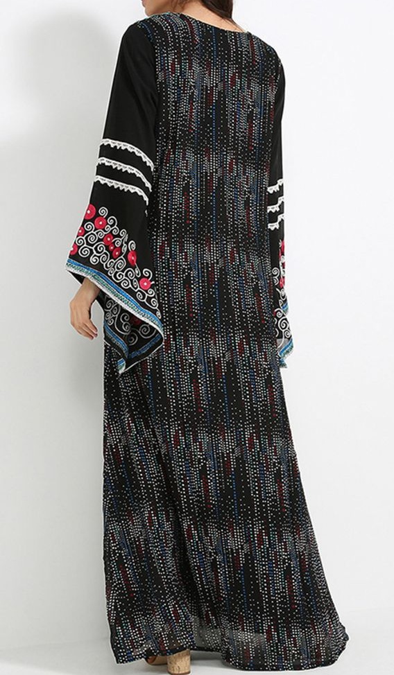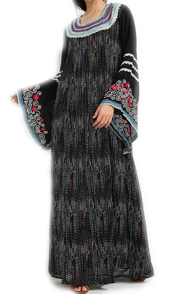 Robe noire longue avec très belle broderies autour du col en couleur et paillettes argentées. Manches évasées brodées.