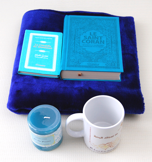 Pack Cadeau Bleu : Coran Français-Phonétique, Citadelle du musulman, bougie parfumée, tapis et mug "A mon cher époux" - REF. 25652 (39.90 €)