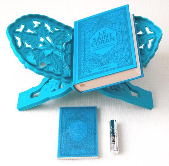 Pack Cadeau Bleu (mixte) : Le Saint Coran arabe avec couverture cuir de luxe + La Citadelle du musulman (fr/ar/ph) + Porte Coran en bois sculpté + Parfum Musc d'Or de luxe (avec étui doré) au choix - REF. 23094 (29.90 €)