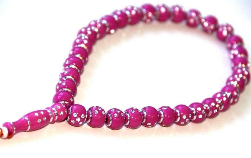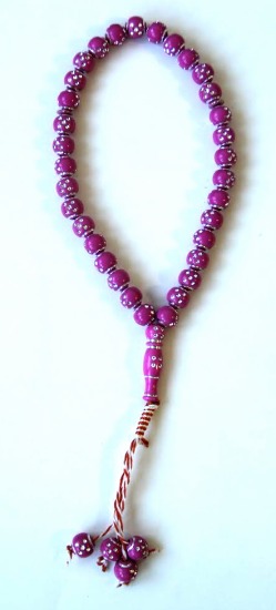 Chapelet "Sebha" rose fuchsia a 33 gros grains avec motifs argentes