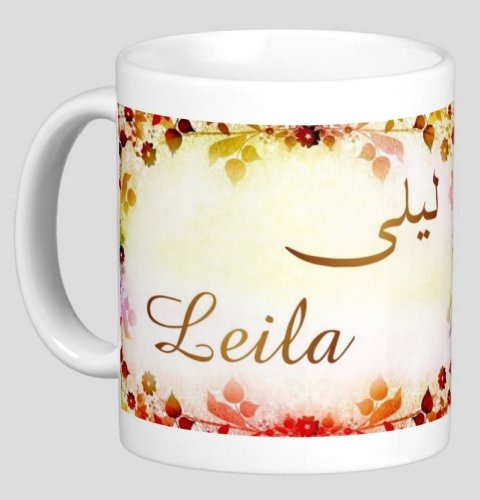 Pack constitué du Parfum (3 ml) "Leila" et du Mug avec le prénom "Leila" écrit en français, en arabe (ليلى) et calligraphié de façon artistique en arabe sur la partie droite.