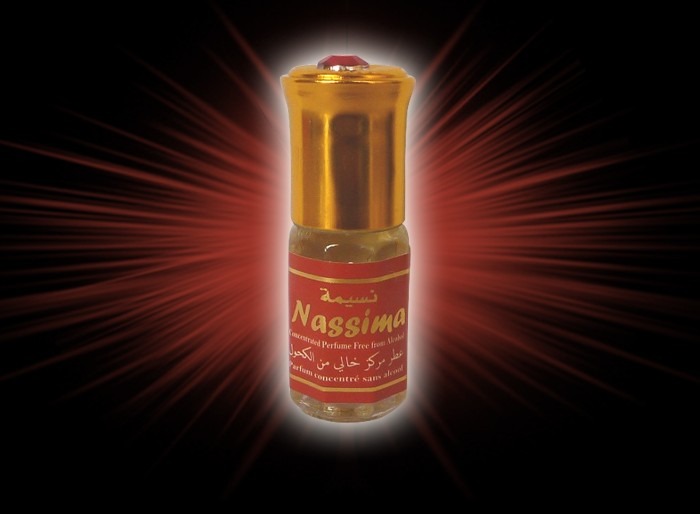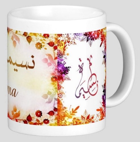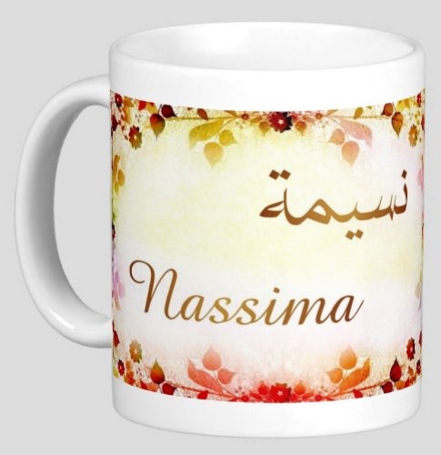 Pack constitué du Parfum (3 ml) "Nassima" et du Mug avec le prénom "Nassima" écrit en français, en arabe (نسيمة) et calligraphié de façon artistique en arabe sur la partie droite.