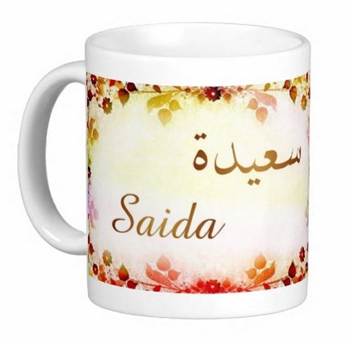 Pack constitué du Parfum (3 ml) "Saida" et du Mug avec le prénom "Saida" écrit en français, en arabe (سعيدة) et calligraphié de façon artistique en arabe sur la partie droite.