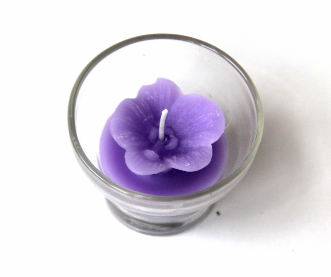 Bougie parfumee sous forme de fleur de couleur mauve avec ruban decoratif
