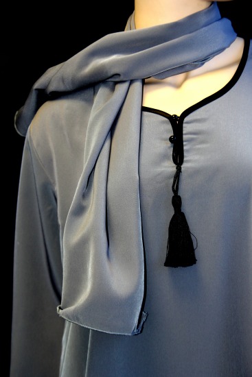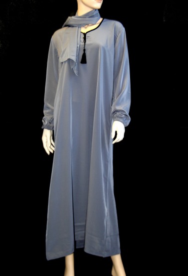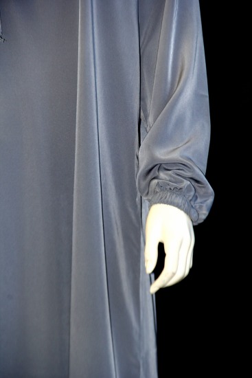 Abaya simple avec manches élastiques et col satiné fermeture avec deux boutons taille XS. Fournie avec son châle assorti.