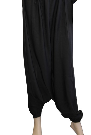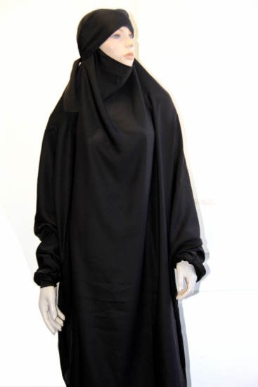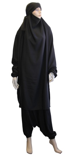 Ce Jilbab deux pièces est composé d’un demi-jilbab (grande cape avec bandeau intégré) avec manches satin, et d’un pantalon assorti.