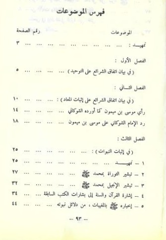 كتاب في العقائد والإيمان، أثبت فيه مصنفه اتفاق جميع الشرائع السماوية على إثبات التوحيد لله تعالى، وإثبات المعاد وهو يوم القيامة وإثبات النبوات ورسالات المرسلين، وجاء بأدلة من نصوص الكتب السماوية كالقرآن والإنجيل والتوراة والزبور وصحف الأنبياء