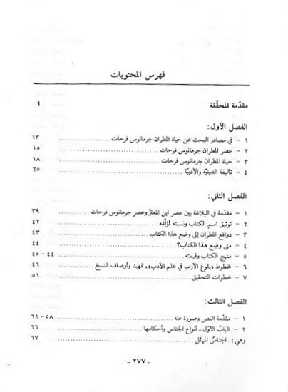 فالكتاب مقدمة ساق بعدها أنواع الجناس المقصود إيراده، وهي تسعة وثلاثون نوعاً مقرونة بأقوال الشعراء على وجه التمثيل والاستشهاد، وأنواع الجناس المسوقة منها: المقرر في كتب الفن، أي البديع، التلخيص للقزوين، وخزانة الأدب للجمري، وأنواع الربيع لابن معصوم، ومنها توسع فيه أهل ما بعد القرن التاسع، فزادوا أنواعاً من أمثلة ذلك: الجناس المسمّط، وهو نوع بلاغي يتعلق بعدد أشطار المنظومة أو البيت وتوزيعها، ويعتبر كتاب فرحات هذا كتاب بلاغي لطلاب جامعة اليوم بل هو معجم لكثير من الشعراء في مختلف العصور، إذ إحتوى الكتاب على قول كل شاعر برع في هذا النوع من الفن الأدبي، خلال تسعة وثلاثين فناً من الفنون البلاغية لأنواع الجناس فقط، ومائة وثلاثة وخمسين فناً من علمي البديع والبيان، وفرحات بعمله هذا يكون قد ألقى ضوءاً على الدور المهم الذي قام به المسيحيون في نشأة الثقافة وحضارتها العربية، والمؤلف انتهج طريقاً تميز به عن سائر معاصريه بأنه فصل أنواعه البديعية وجعلها في بابين مستقلين: الباب الأول في أنواع الجناسات وأحكامها، الباب الثاني في أنواع البديع، الخاتمة: تنبيه الشاعر فيما لم يكن به شاعراً.