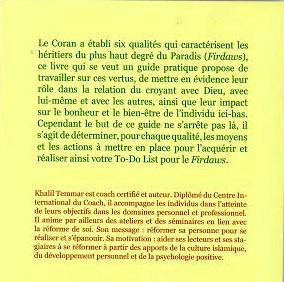 Le Coran a établi six qualités qui caractérisent les habitants du plus haut degré du Paradis (Firdaws).Ce livre qui se veut un guide pratique, propose de travailler sur ces vertus en mettant en évidence leur rôle dans la relation du croyant avec lui-même,avec les autres et avec Dieu générant ainsi le bonheur et le bien-être de l’individu.Cependant, le but ne s’arrête pas la, il s’agit de déterminer, pour chaque qualité, les moyens et les actions à mettre en place pour acquérir et réaliser votre To-Do List pour le Firdaws.