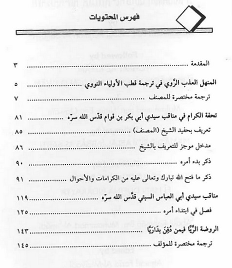 كتاب يجمع نفائس من أنوار العارفين الذين هم نقطة من صاحب الحقائق وسيد الخلائق وجامع اسرار الدقائق سيدنا محمد صلى الله عليه وسلم. أولهم : شيخ الائمة النووي فدرس الكتاب حياته وأساتذته وتلامذته وكتبه وكل ما يتعلق به.وثانيهم: كتاب مناقب الامام ابي بكر بن قوام قدس الله سره، احد أقطاب المغرب وأوتاد الكون المتصرفين.وثالثهم: مناقب سيدي ابي العباس السبتي المغربي قدس الله سره.ورابعهم : الروضة الريا فيمن دفن بداريا