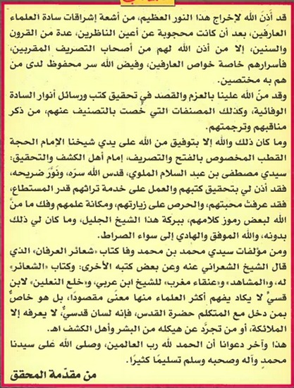 كتاب في التصوف ضم مئة وست شعائر من شعائر القطب الرباني سيدي محمد بن محمد بن وفا رحمه الله ,تضمنت اسرارا هامة اقتطفها من روحه الربانية .وفي مقدمة الكتاب تناول المؤلف بيت السادة الوفائية في مصر فذكر انسابهم ,وتراجمهم ,ووظائفهم .وزواياهم ومواسمهم وغير ذلك مما يهم البيت الجليل.