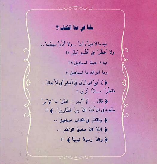 نبذة الناشر : ماذا في هذا الكتاب؟ فيه ما لا عين رأت ولا أذن سمعت ولا خطر على قلب بشر. فيه "حياة اسماعيل" وما أدراك ما اسماعيل؟ "يَا بُنَيَّ إِنِّي أَرَىٰ فِي الْمَنَامِ أَنِّي أَذْبَحُكَ فَانظُرْ مَاذَا تَرَىٰ قَالَ يَا أَبَتِ افْعَلْ مَا تُؤْمَرُ سَتَجِدُنِي إِن شَاءَ اللَّهُ مِنَ الصَّابِرِينَ". "وَاذْكُرْ فِي الْكِتَابِ إِسْمَاعِيلَ ۚ إِنَّهُ كَانَ صَادِقَ الْوَعْدِ وَكَانَ رَسُولًا نَّبِيًّا".
