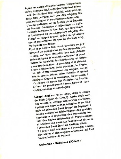 Après les essais des orientalistes occidentaux et les exposés édulcorés des historiens orientaux, druzes dans leur majorité, voici enfin un texte très complet sur l'une des religions les plus ésotériques et mystérieuses du monde.