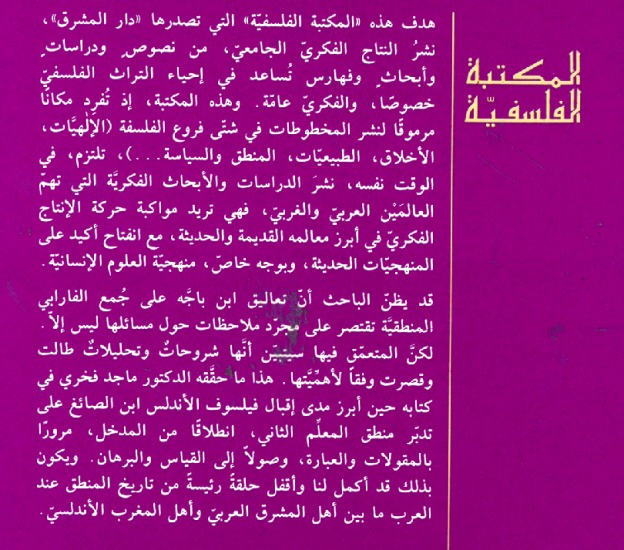 أبو بكر بن الصّائع المعروف بإبن باجه، فيلسوف أندلسي، أقبل على تدبّر منطق الفارابي والتّعليق على أجزائه المختلفة، وقد إعتمد الكاتب في تحقيق النّصوص على مخطوطة أكسفورد ومخطوطة الأسكوريال. إنقسم هذا الكتاب إلى أربعة فصول : الأوّل يعرّف فيه غرض الكتاب، والثّاني يعرّف فيه الكلّيات والأشخاص ولواحقها المشتركة والخاصّة، والثّالث يعرّف فيه الكلّيات المفردة ولواحقها، والرّابع الكلّيات المركّبة ولواحقها. لقد خرج إبن باجه على النّهج التّقليدي في الإقتصار على ألفاظ فرفوريوس الخمسة، وأدخل في إطار "إيساغوجي" بابا خاصّا هو النّظر في المركّبات منها. وللكتاب أهميّة كبرى في دراسة علم المنطق.