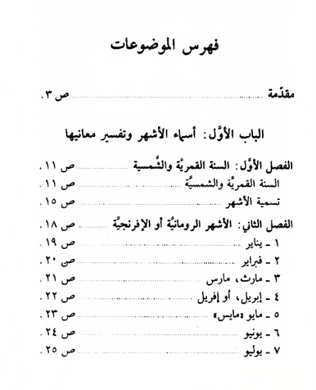 عندما ترغب في النفاذ إلى الماضي البعيد، إلى مجاهل التاريخ الذي يسبق التاريخ المدوّن، ولا تجد أمامك إلا بعض الآثار المبعثرة في الخرائب والعاديات المطمورة في القبور تستنطقها فلا تنطق إلا قليلاً، تعود إلى "الكلمة" التي رافقت الإنسان في تطوره الحضاري الطويل، إذ في ثناياها، في اجتماع حروفها، صور وخيالات قد تعيد لها بعض القصة. ولكن "الكلمة" من نتاج العاطفة قبل أن تكون من نتاج الفكر، من نتاج السحر والغناء المقدّس، قبل أن تكون من نتاج العلم والفكر المركز، فلا معدى أن تأتي الكملة مشوبة بالعنصر الإنساني الذاتي، فلا يصح الركون إليها دوماً في قضايا التاريخ والفكر، غير في دراسته هذه والتي هي طي هذا الكتاب حول أسماء الأشهر والأيام، والعدد ومعانيها، لجأ إلى الاستنتاج اللغوي، أي أنه وقع فيما حظر عدم الوقوع فيه، وربما يكون قد توهم في استنتاجه في بعض الأحياء، إلا أنه حاول أن يقدم استنتاجاته مبنياً على الاستنتاج اللغوي عوضاً عن لجوئه إلى الاستنتاج التاريخي المبني على دراسة لغوية فقهية، لأنه كثيراً ما يكون هذا الاستنتاج عرضة للخطأ. وكثيرون هم المؤرخون الذين اعتمدوا "الكلمة" مصدراً رئيسياً وحيداً في فهم التاريخ، أو في تقديرات مميزات الشعوب فوقعوا في أخطاء فاضحة. وقد تضمنت الدراسة أبواباً وفصولاً دارت حول النقاط التالية: الباب الأول أسماء الأشهر وتفسير معانيها، السنة القمرية والشمسية، الأشهر الرومانية أو الافرنجية، الأشهر السريانية أو الأشهر الرومية، الأشهر العربية الإسلامية، الأشهر العربية الجاهلية، الأشهر الثمودية. الباب الثاني: أسماء الأعداد وتفسير معانيها: أسماء أيام الأسبوع: أيام الأسبوع وتسمياتها القديمة أو الجاهلية، تسمياتها المستحدثة أو الإسلامية، تسمياتها في اللغة اللاتينية واللغة الفرنسية، تسمياتها في اللغة السكسونية القديمة والإنكليزية.