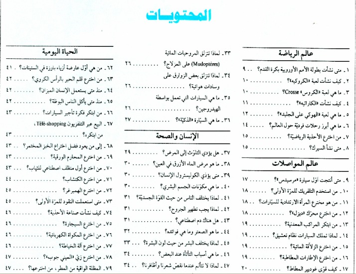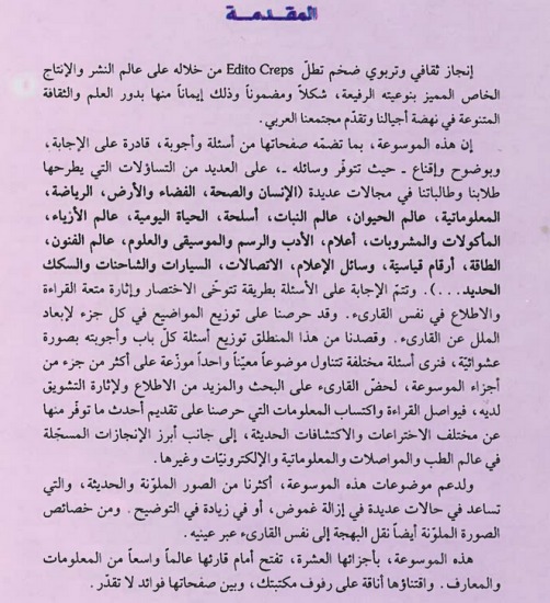 نبدة الناشر: إن هذه الموسوعة، بما تضمه صفحاتها من أسئلة وأجوبة، قادرة على الإجابة، وبوضوح وإقناع على العديد من التساؤلات التي يطرحها طلابنا وطالبتنا في مجالات عديدة (الإنسان والصحة، الفضاء والأرض، عالم النبات، الحياة اليومية، عالم الفنون، وسائل الإعلام، السيارات والشاحنات...). وتتم الإجابة على الأسئلة بطريقة تتوخى الاختصار وإثارة متعة القراءة والاطلاع في نفس القارئ. وقد حرصنا على توزيع المواضيع في كل جزء لإبعاد الملل عن القارئ. وقصدنا من هذا المنطلق توزيع أسئلة كل باب وأجوبته بصورة عشوائية، فنرى أسئلة مختلفة تتناول موضوعا معينا واحدا موزعة على أكثر من جزء من أجزاء الموسوعة، لحضّ القارئ على البحث والمزيد من الاطلاع ولإثارة التشويق لديه، فيواصل القراءة واكتساب المعلومات التي حرصنا على تقديم أحدث ما توفر منها عن مختلف الاختراعات والاكتشافات الحديثة، إلى جانب أبرز الإنجازات المسجلة في عالم الطب والمواصلات والمعلوماتية والإلكترونيات وغيرها.