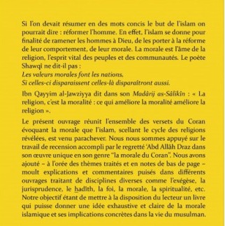Cet ouvrage réunit l’ensemble des versets du Coran évoquant la morale que l’islam prône,scellant ainsi le cycle des religions révélées. Nous nous sommes appuyé sur le travail de recension accompli par le regretté ‘Abd Allâh Draz dans son œuvre "la morale du Coran". Nous avons ajouté,à l'aune des thèmes traités et en notes de bas de page de nombreuses explications et commentaires puisés dans différents ouvrages traitant de disciplines diverses telles que l’exégèse, la jurisprudence, le hadîth, la foi, la morale, la spiritualité, etc... Notre objectif est de mettre à la disposition du lecteur un livre qui puisse donner une idée exhaustive et claire de la morale islamique et de ses implications concrètes dans la vie du musulman et de l'humanité dans son entièreté.