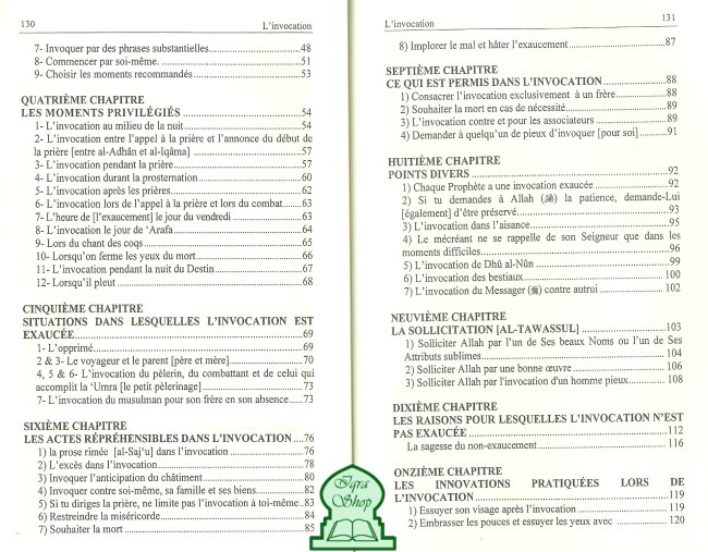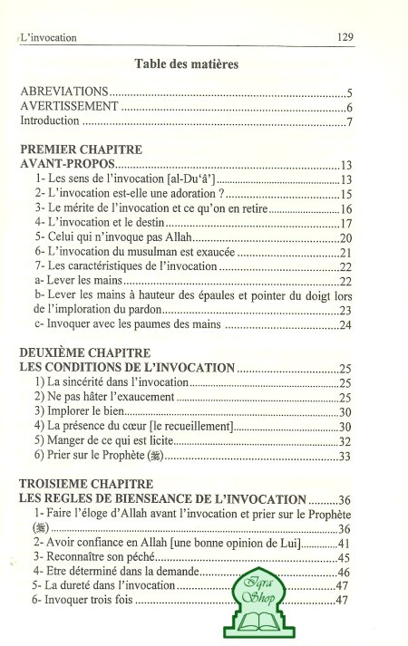 Ceci dit, pour être exaucée, l'invocation doit remplir certaines conditions que chaque musulman doit connaitre. Ce livre se propose de les décrire ainsi que les règles de bienséance à observer, les moments et situation d'exaucement, les erreurs à éviter et bien d'autres sujets se rapportant à ce culte auquel nous nous adonnons quotidiennement, tout cela dans un style simple et attrayant.