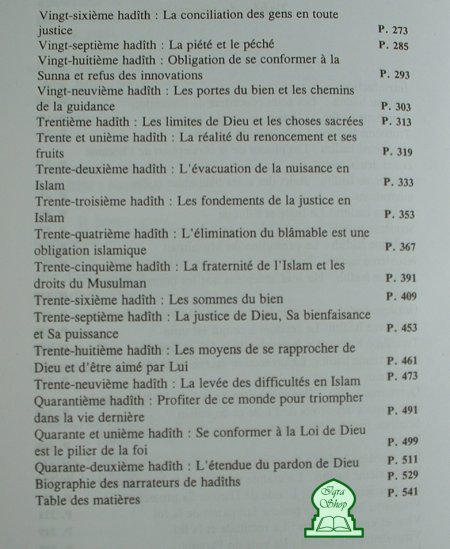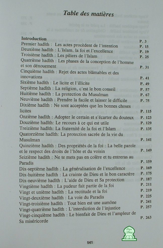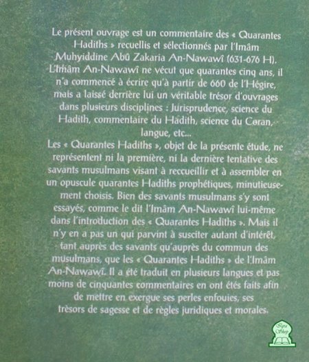 Le présent ouvrage est un commentaire des Quarante Hadîths recueillis et sélectionnés par l'Imâm Muhyiddine Abû Zakaria An-Nawawî (631-676 H).L'Imâm An-Nawawî ne vécut que quarante cinq ans, il n'a commencé à écrire qu'à partir de 660 de l'hégire, mais a laissé derrière lui un véritable trésor d'ouvrages dans plusieurs disciplines : jurisprudence, science du Hadith, commentaire du Hadith, science du Coran, langue, etc... Les Quarante Hadiths, objet de la présente étude, ne représentent ni la première, ni la dernière tentative des savants musulmans visant à recueillir et à assembler en un opuscule quarante Hadiths prophétiques, minutieusement choisis. Bien des savants musulmans s'y sont essayés, comme le dit l'auteur lui même dans l'introduction des Quarante Hadîths. Mais il n'y en a pas un qui parvint à susciter autant d'intérêt, tant auprès des savants qu'auprès du commun des musulmans, que les Quarante Hadiths de l'Imâm An-Nawawî. Il a été traduit en plusieurs langues et pas moins de cinquante commentaires en ont été faits afin de mettre en exergue ses perles enfouies, ses trésors de sagesse et de règles juridiques et morales.