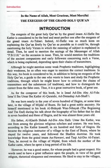 The Exegesis of the Great Holy Qur'an by the grand imam Al-Hafiz Ibn Kathir is considered to be the best and most perfect one after the exegesis of the grand imam At-Tabari. Indeed, Al-Hafiz was so much keen on explaining the Qur'an firstly by Qur'an as possible as it could be, through mentioning the holy verses in which the meaning of subject is explained in detail. Then, he used to mention the sayings of the Messenger of Allah (s). Then, he would mention the traditions of the Companions and early followers concerning such a verse, which is being explained, depending upon their chains of transmitters. Although he might mention some weak Prophetic traditions, highlighting their weakness, he so often was eager to mention the correct traditions. In this way, his book is considered to be, in addition to being an exegesis of the Holy Qur'an, a guide to the one who wants to learn and study the Prophetic traditions, through which he might know how to criticize the chains of transmitters and the substances of tradition, and how to distinguish the correct from the false ones. Thus, it is a great instructive book of great use. This work consists of over two million five hundred thousand words, nearly one-third of which contains the chains of transmitters mentioned by lbn Kathir of the Prophetic traditions and the sayings of the Companions and the early followers, upon which he depends in explaining the meaning of the holy verses of the Qur'an. The publisher did their best to remove those chains of transmitters, but maintained the last one or two narrators. They also made a hard effort, as possible as it could be, to deprive our translation of the Israelite tales and stories, upon which Ibn Kathir depends, to some extent, in his commentaries. He himself explains his situation from those stories and tales in his introductory. Our method here is to mention at first the holy verse in Arabic, followed by its translation into English.