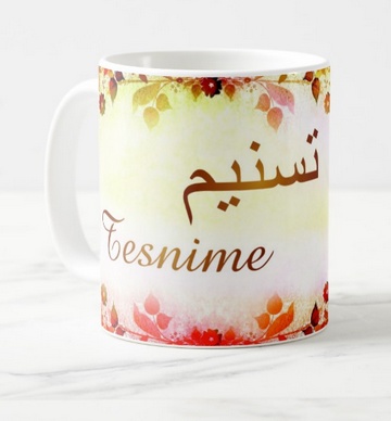 Mug avec le prénom "Tesnime" écrit en français, en arabe (تسنيم) et calligraphié de façon artistique en arabe sur la partie droite.