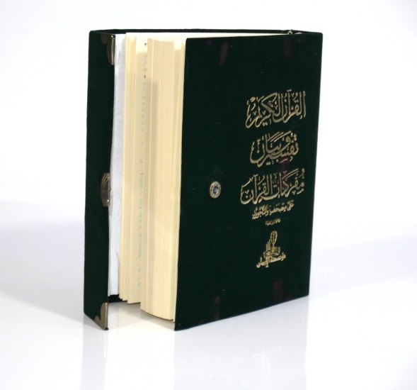 Le Saint Coran avec règles de lectures en couleur et explications des termes en arabe sur le côté. Couverture en daim qui se referme comme dans une boite pour le protéger lors du transport.