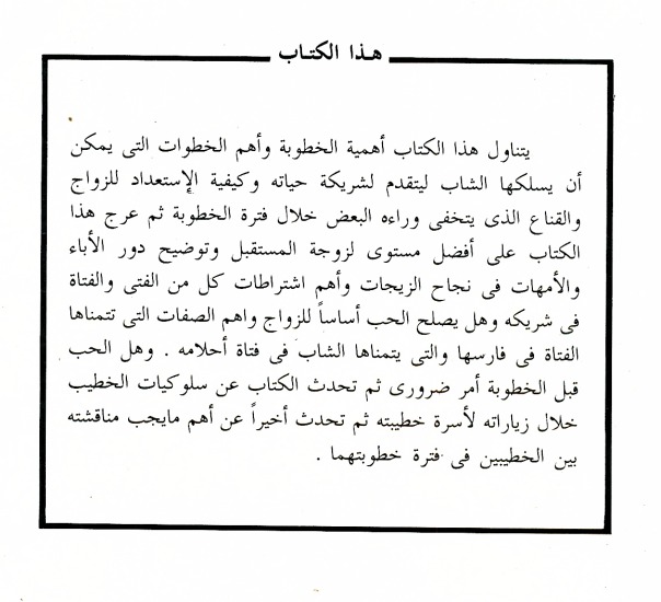 يتناول هذا الكتاب أهمية الخطوبة وأهم الخطوات التي يمكن أن يسلكها الشاب ليتقدم لشريكة حياته وكيفية الإستعداد للزواج والقناع الذي يختفى وراءه البعض خلال فترة الخطوبة ثم عرج هذا الكتاب على أفضل مستوى للزوجة المستقبل وتوضيح دور الأباء والأمهات في نجاح الزيجات وأهم الصفات التي تتماناها الفتاة في فارسها والتي يتمناها الشاب في فتاة أحلامه. وهل الحب قبل الخطوبة أمر ضروري ثم تحدث الكتاب عن سلوكيات الخطيب خلال زيارته لأسرة خطيبته ثم تحدث أخيرا عن أهم ما يجب مناقشته بين الخطيبين في فترة خطوبتهما.