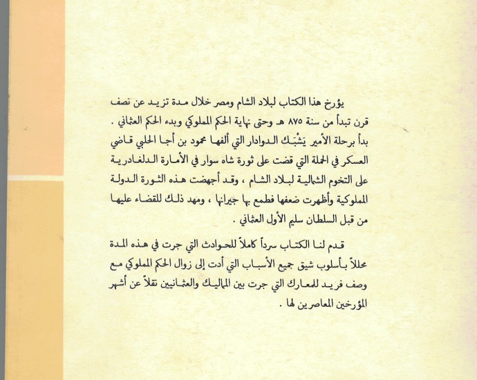 يؤرخ هذا الكتاب لبلاد الشام ومصر خلال مدة تزيد عن نصف قرن تبدأ من سنة 875هـ وحتى نهاية الحكم المملوكي وبدء الحكم العثماني. بدأ برحلة الأمير يشبك الدوادار التي ألفها محمود بن أجا الحلبي قاضي العسكر في الحملة التي قضت على ثورة شاه سوار في الإمارة الدلغادرية على التخوم الشمالية لبلاد الشام، وقد أجهضت هذه الثورة الدولة المملوكية وأظهرت ضعفها فطمع بها جيرانها، ومهد ذلك للقضاء عليها من قبل السلطان سليم الأول العثماني. قدم لنا الكتاب سرداً كاملاً للحوادث التي جرت في هذه المدة محللاً بأسلوب شيق جميع الأسباب التي أدت إلى زوال الحكم المملوكي مع وصف فريد للمعارك التي جرت بين المماليك والعثمانيين نقلاً عن أشهر المؤرخين المعاصرين لها.