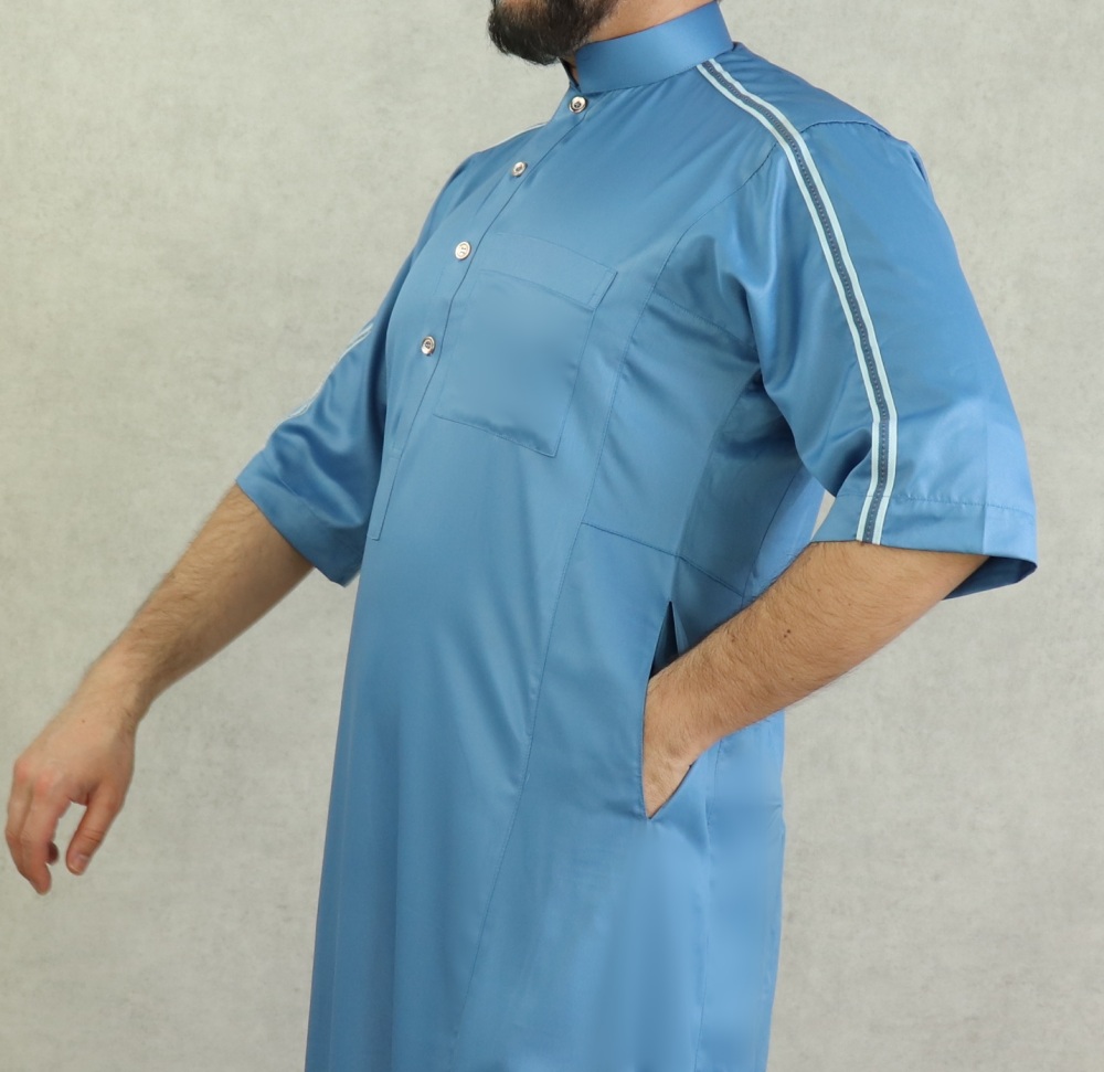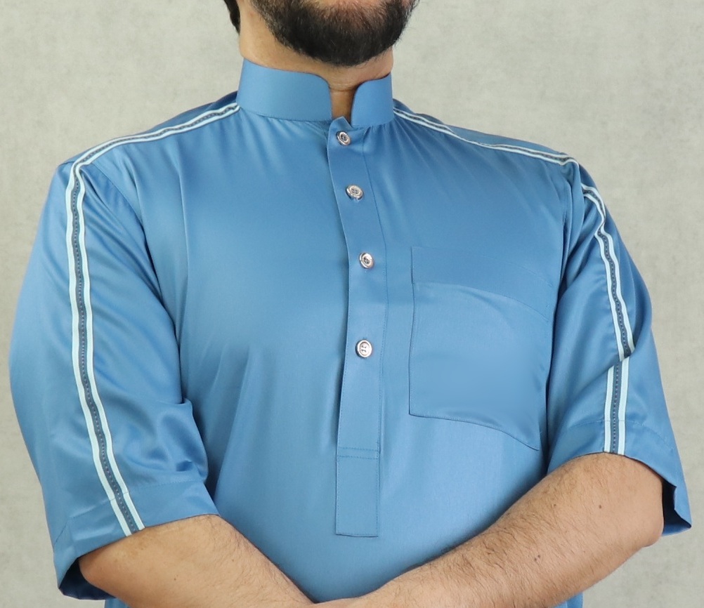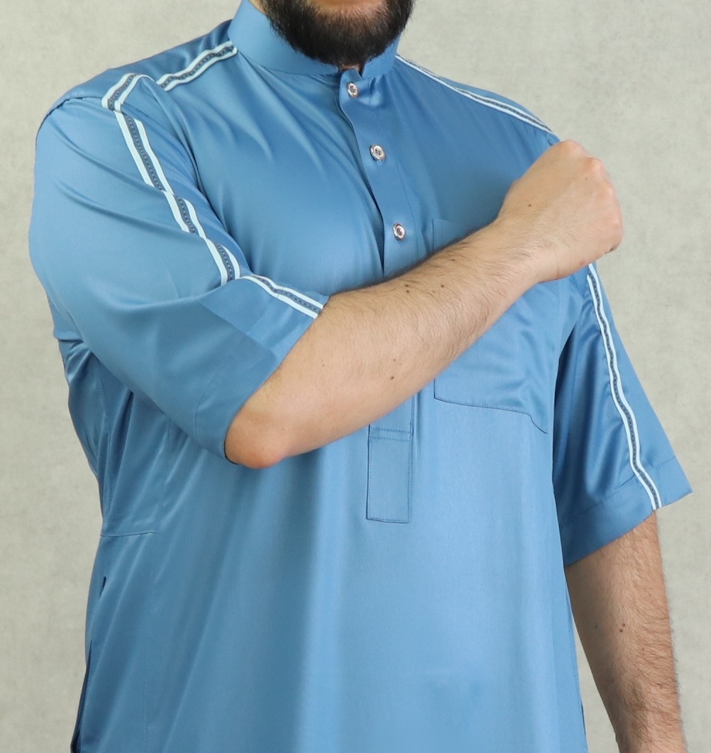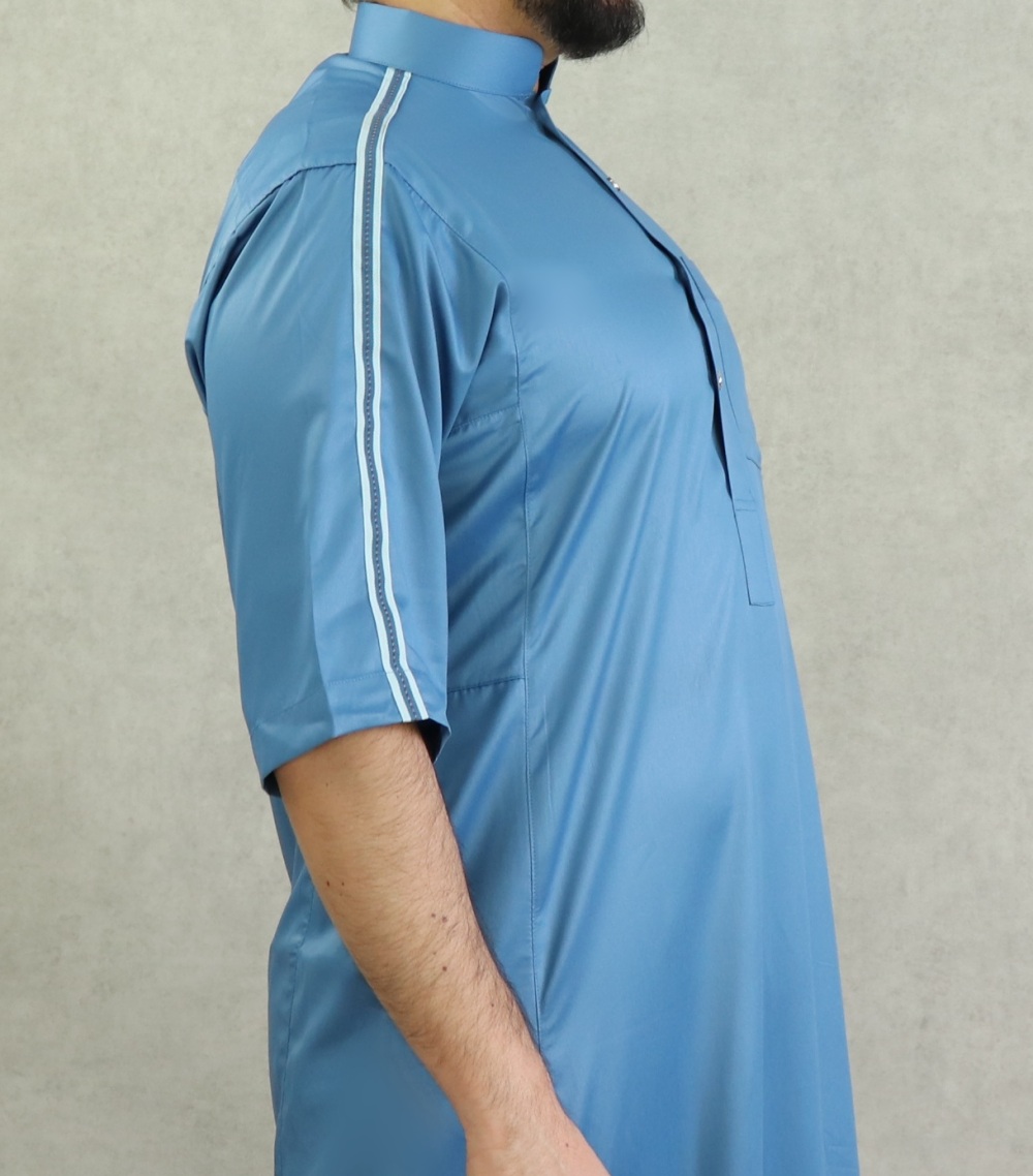 Qamis de marque AlBai de couleur bleu avec bandes décorative sur les manches à partir des épaules. Boutons argentés sur le devant.