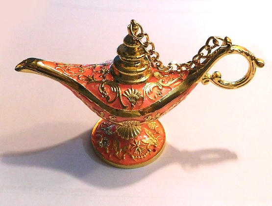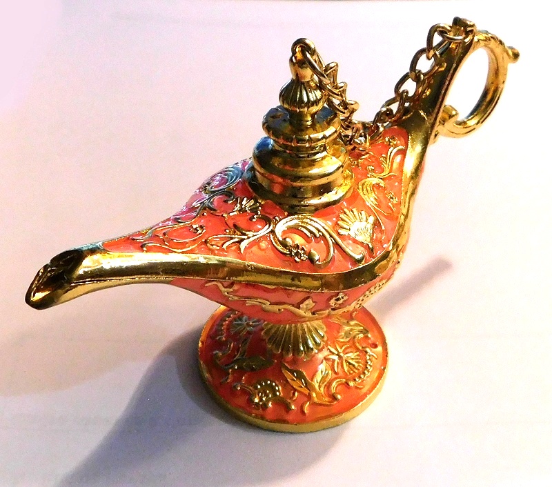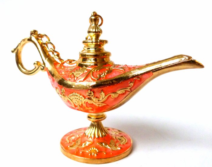 Très bel objet décoratif. Cette lampe d'Aladin métallique, aux couleurs dorée rouge et rose est livrée avec sa boîte cadeau et peut donc être offerte.