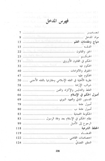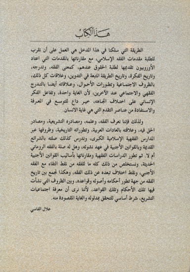 الطريقة التي سلكنا في هذا المدخل هي العمل على أن نقرب للطلبة مقدمات الفقه الإسلامي، مع مقارناتها بالمقدمات التي اعتاد الأروبيين تقديمها لطلبة الحقوق عندهم كمعنى الفقه، وتدرجه، وتاريخ الفكرة، وتاريخ الطريقة المتبعة في التدوين، وعلاقات كل ذلك بالظروف الاجتماعية وتطورات الأحوال، وعلاقاته أيضا باتدرج الفقهي والاجتماعي عند الآخرين، لأن الغاية واحدة، وتفاعل الفكر الإنساني على اختلاف اتجاهه، خير داع للتوسع في المعرفة والاستفادة من عناصر التقدم التي هي غاية الانسان.