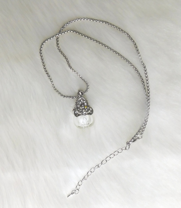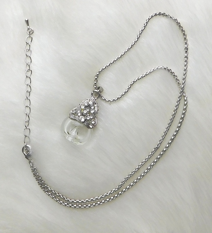 Chaîne argentée avec bijoux pendentif décoré de diamants contenant un très bon parfum fleuri. Pour emporter son parfum préféré toujours sur soi.