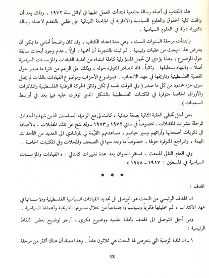 في هذه الدراسة المعمقة والموسعة عن النخب السياسية الفلسطينية طوال واحد وثلاثين عاماً، تحلل الكاتبة الفكر السياسي والبنية الاجتماعية لشتى الأحزاب والتنظيمات الفلسطينية. يسد الكتاب فراغاً كبيراً في التأريخ الفلسطيني، ويوفر مصدراً مهماً للمعلومات عن فترة حرجة من مسيرة الحركة الوطنية الفلسطينية. ويتضمن الكتاب ملحقين، يحتوي الأول على 71 وثيقة تاريخية، ويشتمل الثاني على جداول بأسماء أعضاء اللجان والمؤتمرات والأحزاب والوفود المذكورة في الحقبة التي يعالجها.