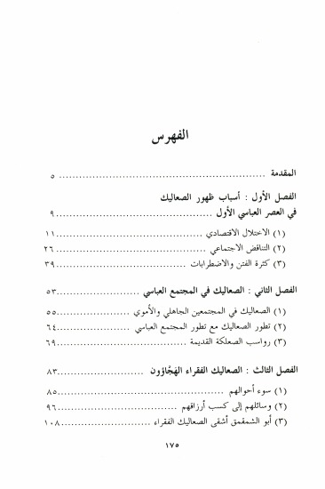 والكتاب مقسوم بين خمسة فصول، درس المؤلف في أولها الأسباب التي هيأت لظهور الصعاليك؛ من العصر العباسي الأول، وخصص الفصل الثاني للصعاليك في المجتمع العباسي، ووازن فيه المؤلف بين الصعاليك الجاهليين والأمويين، وبين الصعاليك العباسيين، وافرد الفصل الثالث للصعاليك الفقراء الهجائين، وعرض فيه لسوء أحوالهم وما كانوا يعيشون فيه هم وأبناؤهم وأهلوهم من ضيق وإملاق وعري وهزال... ووقف في الفصل الرابع عند الصعاليك الفقراء اللصوص، وتحدث فيه عن حركتهم، ومبادئهم التي التزموا بها، وأهدافهم التي سعوا إليها، وأفرد الفصل الخامس للحديث عن ثلاث طوائف متميزة من الصعاليك العباسيين، جمع الفقر والإقلال والضياع بينها ودفعها إلى التصعلك دفعا، أولها طائفة العيارين، وثانيها طائفة الشطار، وثالثها طائفة الطفيليين.