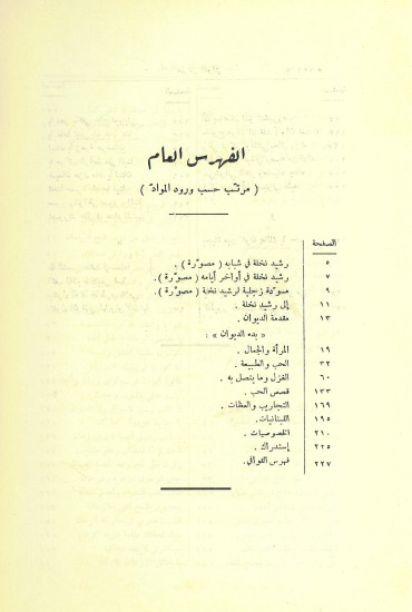 ثم رتب الديوان على سبعة أو باب: أولها: "المرأة والجمال". وهو في وصفها وتشبيهها من خلال الشعور بها. الباب الثاني: "الحب والطبيعة". وفيه القصائد ذات التوصيل بينهما. الباب الثالث: "الغزل وما يتصل به". وقد جمع هذا الباب قصائد نظمها رشيد نخلة وهو في متقبل الصبا، وقصائد نظمها وهو السن العالية. الباب الرابع: "قصص الحب"، وفيه القصار من الحكايات والوقائع.