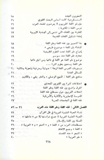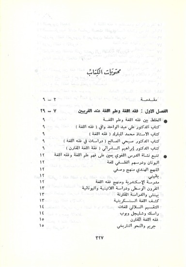هذا بحث اختاره المؤلف، وجعل موضوعه "فقه اللغة في الكتب العربية" ليتخذه وسيلة إلى دراسة "المنهج" العربي في درس اللغة في كتب معينة، ولكي لا يتشعب البحث، ولكي لا يخضع للتعميمات، فقد قصره على كتب ثلاثة منها كتابات سماهما صاحباهما "بفقه اللغة" وهما كتابا ابن فارس والثعالبي، أما الثالث فهو كتاب الخصائص لابن حنى، ولما كان الهدف من البحث هو تحديد المصطلحات بما قد يساعد على رفع شيء من هذا الغموض فقد تناول المؤلف تاريخ "فقه اللغة" و"علم اللغة" عند الغربيين وعند العرب، ليصل منه إلى محاولة "فهم" المنهج العربي.