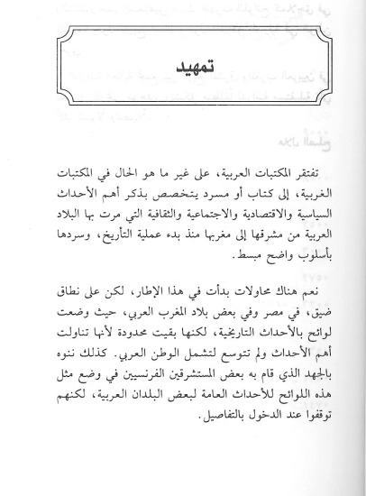 يضمّ الكتاب بين طياته دراسة تاريخية ثنائية اللغة (فرنسي-عربي) تجمع بين تاريخ المشرق والمغرب العربيين في تسلسل تاريخي موحد، يسرد فيها المؤلف أهم الأحداث السياسية والاقتصادية والاجتماعية والثقافية التي مرت بها البلاد العربية من مشرقها إلى مغربها منذ بدء عملية التأريخ. وقد سردها المؤرخ بأسلوب واضح مبسط.
