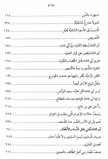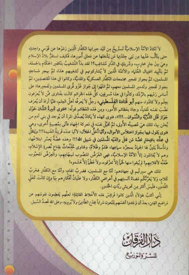 لقد بدأ التشغيب بتكفير الحكام بالجملة، ثم بتأييد اغتيال العلماء والئمة، الذين لا يشاركونهم فى تشغيبهم هذا، ثم بهجر مساجد المسلكيتة ثم بجواز تفجين مجتمعات الكفار العسكرية والمدنية، وكانوا فى هذا مقتصدين، بجواز تفجير وتدمير المسلمين معهم، ثم انتهوا إلى جواز غزو قرى المسلمين وتفجيرها، على أساس رميهم بالردة، وكانوا فى هذا مسرفين، كل هذه الجرائم كانت بفتاوى ممن لا يعرفون بعلم ولا كادواء منهم أو قتادة الفلسطينى، رجل لا يعرفه أهل العلم، فلما أراد أن يعرف نصب نفسه مفتيًا وجاء بعظائم الأمورء ومن هذه العظائم قوله: "فتوى كبيرة الشان حول جواز قتل الذرية والنسوان..!!".