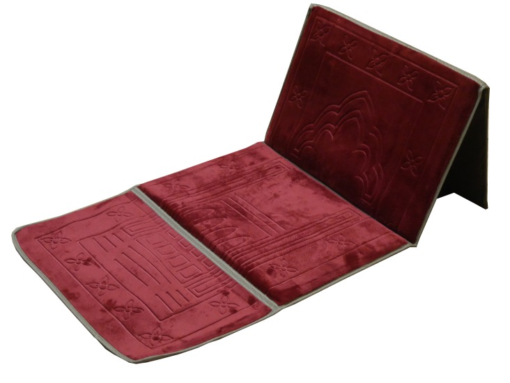 Tapis de prière musulman rembouré pliable et transportable avec sa sacoche de transport. Par une simple manipulation, se transforme rapidement de tapis à repose-dos (chaise, dossier, adossoire...)