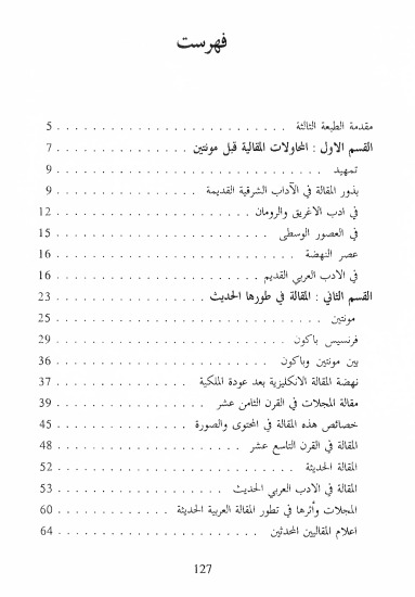 يستقرئ المؤلف في هذا الكاتب المحاولات المقالية في الأدب العربي، ثم يعرض للمقالة في طورها الحديث ويقف عند أساليب فن المقالة . يدرس الكتاب تطور النظرية الشعرية، وأسس الاختلاف بين المذاهب الشعرية، وفصول في نقد الشعر من خلال عنوانات فرعية عدة .