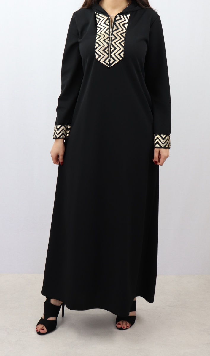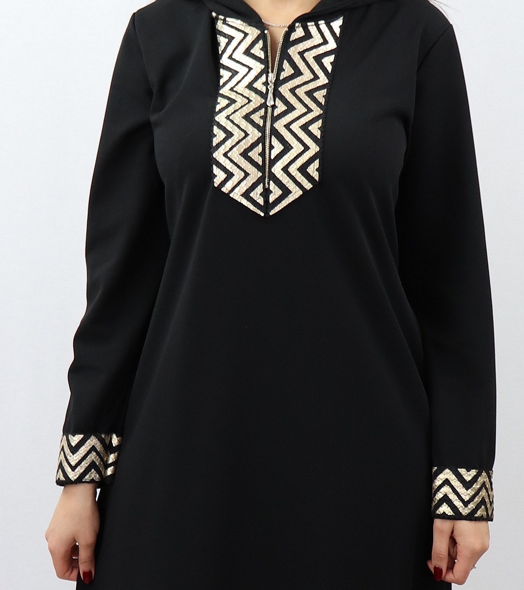 Robe longue type abaya marocaine pour femme avec capuche et motifs dorés - Couleur noire Vetement & Accessoire Coup de coeur