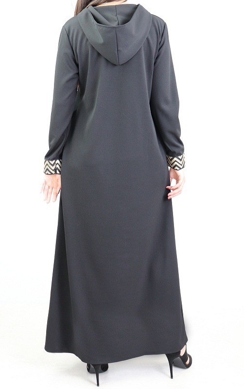 Abaya toute saisons avec capuche et ouverture zip au niveau du cou. Jolis motifs dorés au niveau de la poitrine et des manches, deux poches sur les côtés. Tissu épais (non transparent) et fluide (élastique).
