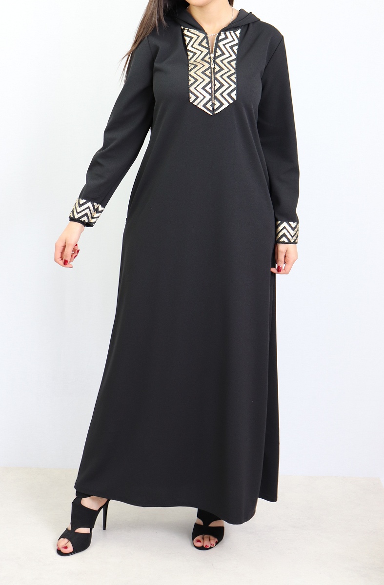 Robe longue type abaya marocaine pour femme avec capuche et motifs dores - Couleur noire
