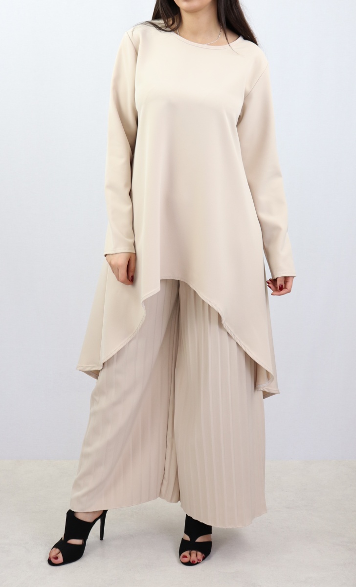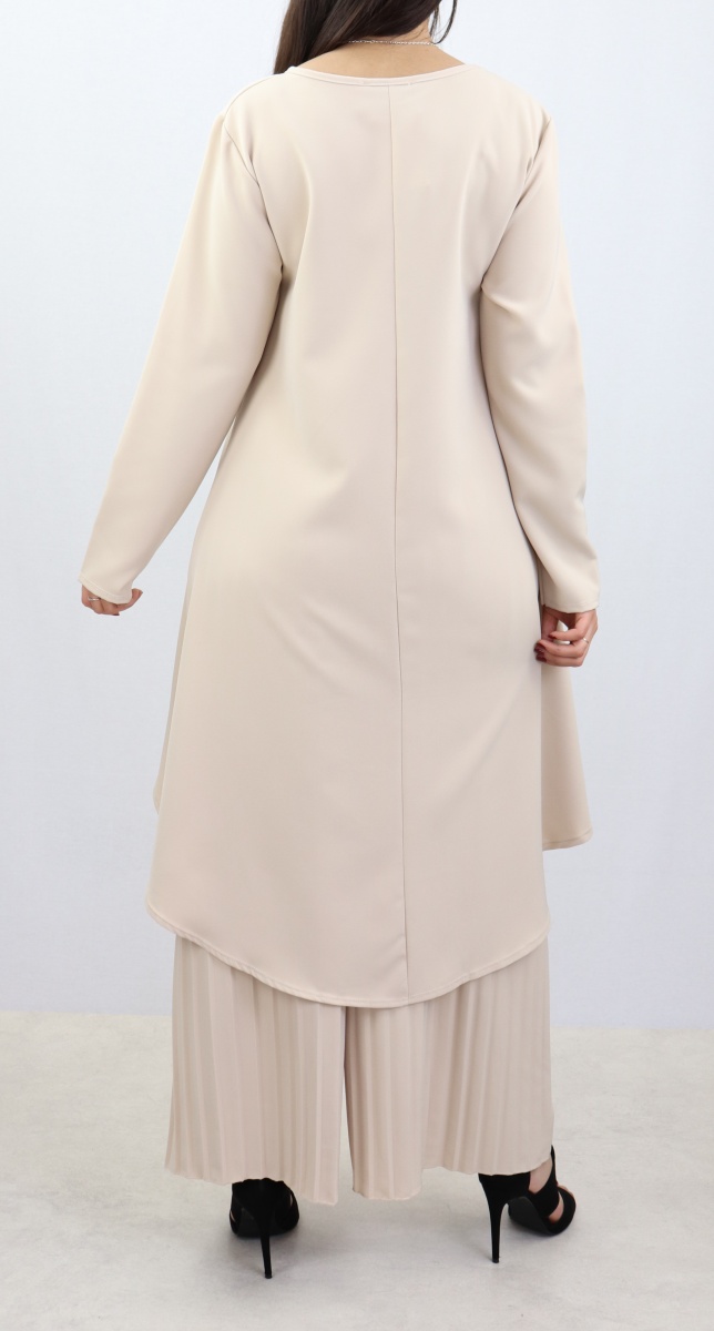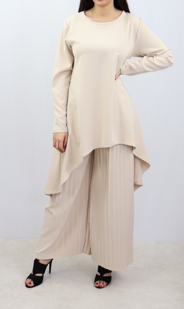 Ensemble élégant constitué d'une tunique évasée et d'un pantalon palazzo plissé. Vous pourrez porter cet ensemble très confortable toute l'année. Tissu de type crêpe léger et fluide. Cet ensemble convient à toutes les tailles de 1m60 à 1m75.