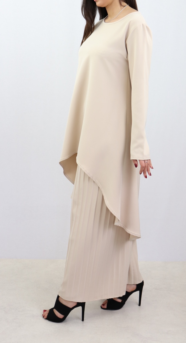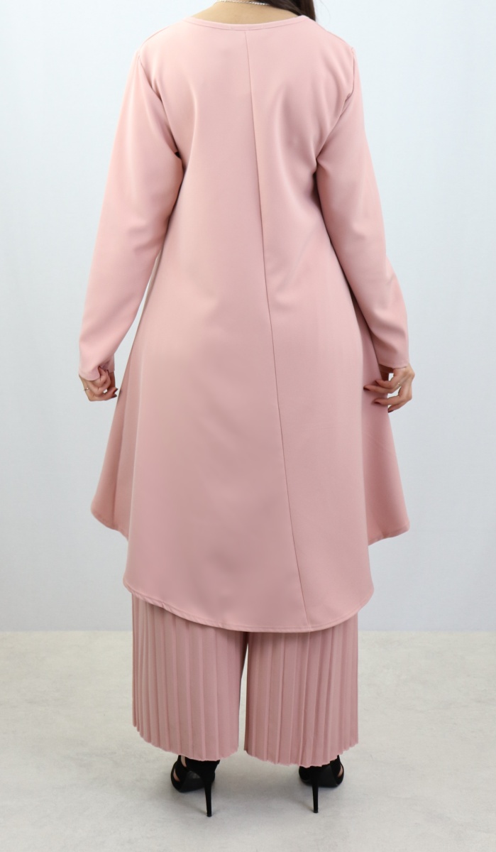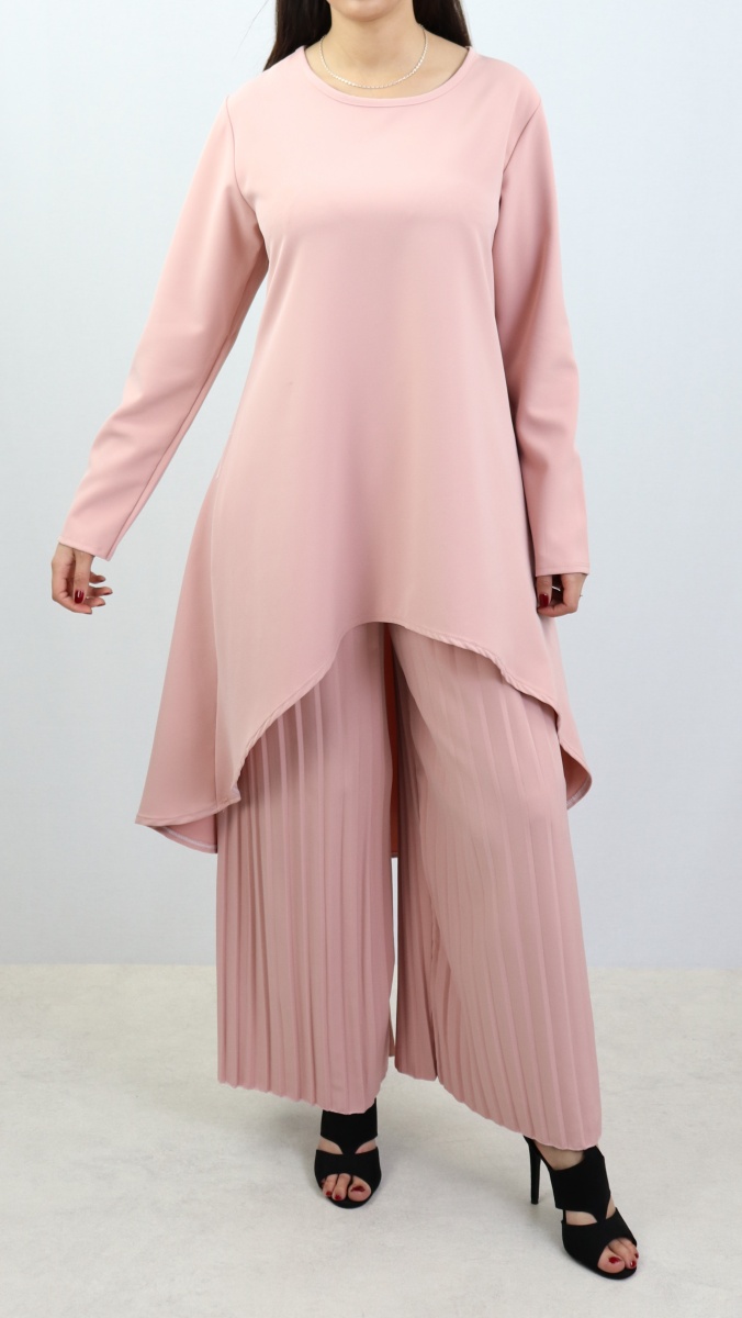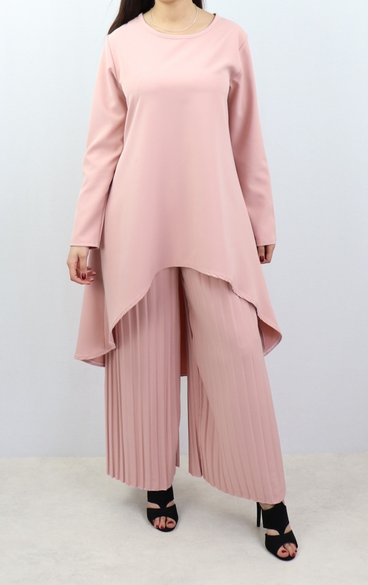 Ensemble élégant constitué d'une tunique évasée et d'un pantalon palazzo plissé. Vous pourrez porter cet ensemble très confortable toute l'année. Tissu de type crêpe léger et fluide. Cet ensemble convient à toutes les tailles de 1m60 à 1m75.
