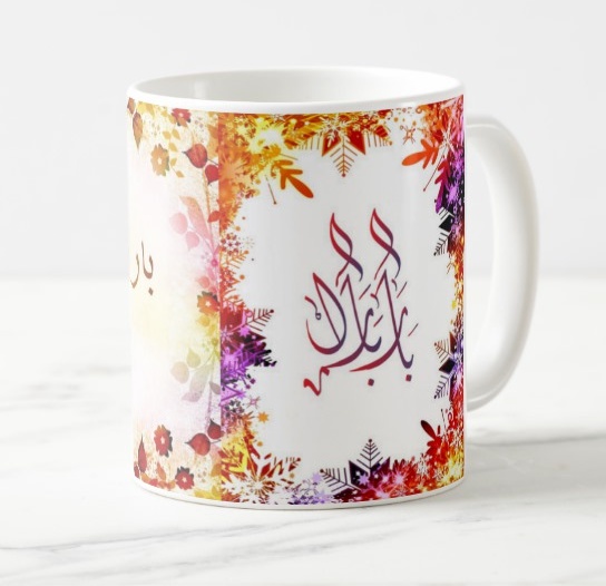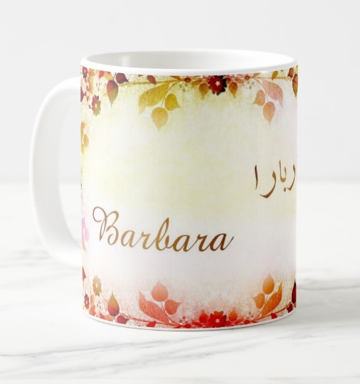 Mug avec le prénom "Barbara" écrit en français, en arabe (باربارا) et calligraphié de façon artistique en arabe sur la partie droite.