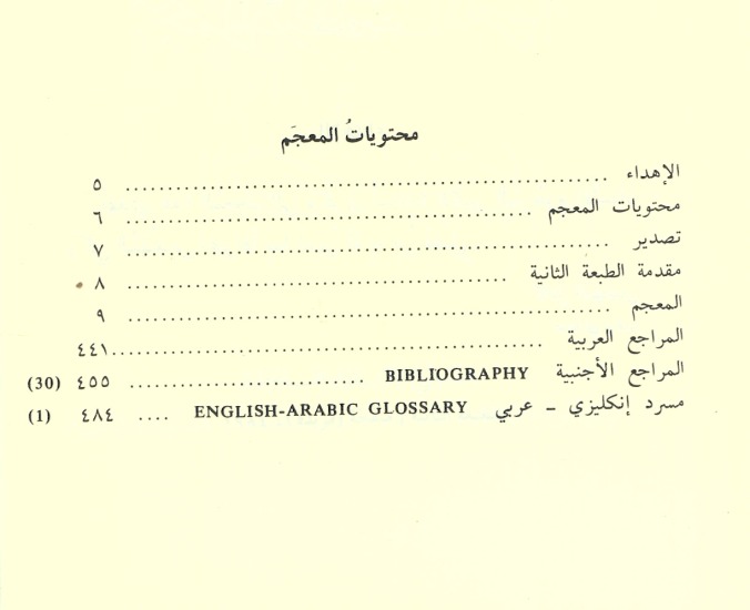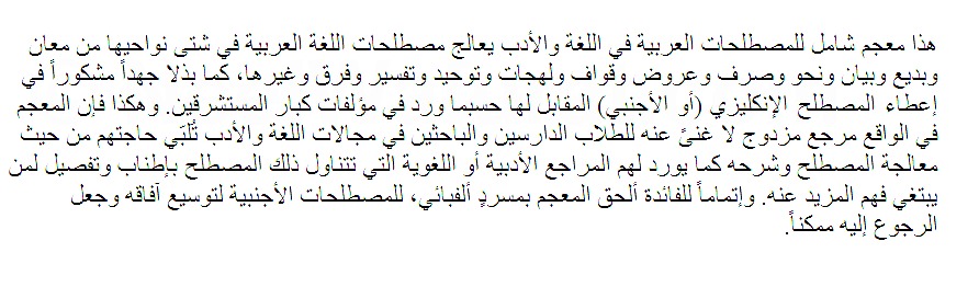هذا معجم شامل للمصطلحات العربية في اللغة والأدب يعالج مصطلحات اللغة العربية في شتى نواحيها من معان وبديع وبيان ونحو وصرف وعروض ولهجات وتوحيد وتفسير وفرق وغيرها كما بدل جهدا مشكورا في إعطاء المصطلح الإنجليزي المقابل لها حسبما ورد في مؤلفات كبار المستشرقين