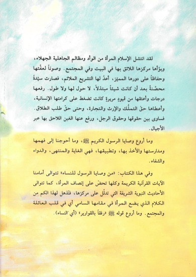 في هذا الكتاب تتوالى أمامنا الآيات القرآنية الكريمة وكلها تحض على إنصاف المرأة كما تتوالى الأحاديث النبوية الشريفة التي تدلل على مركزها فنذهل لهذا الكم من الكلام الذي يضع المرأة في مقامها السامي أي في قلب العائلة والمجتمع