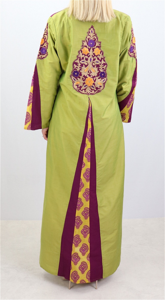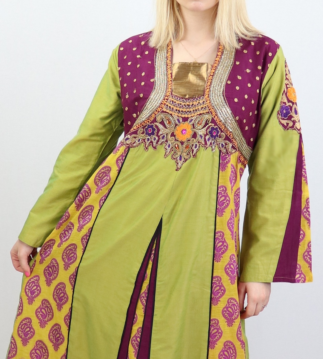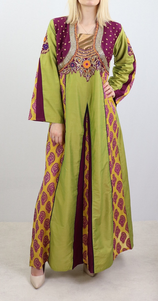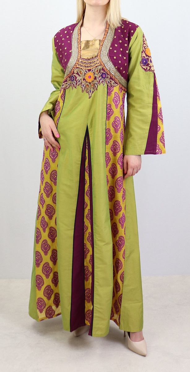 Robe de soiree orientale maxi-longue pour femme - Couleur vert clair brillant et violet avec parties dorees
